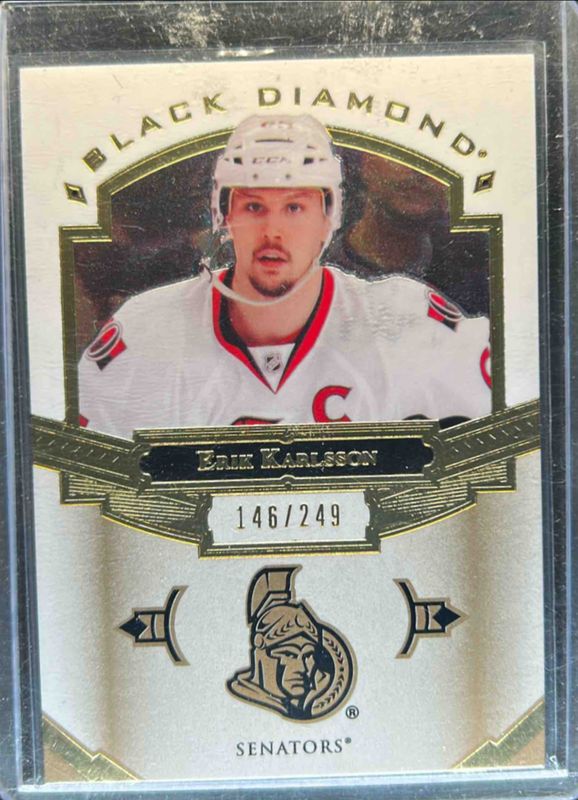The Erik Karlsson 2016 Upper Deck Black Diamond #BDB-EK Base /249 card is 1 of 9 Erik Karlsson's card variations in the 2016 Upper Deck Black Diamond set being tracked by Sports Card Investor, including Pure Black /99, Pure Black Prime Relics /50, 2016 Upper Deck Exquisite Collection /149, Run for the Cup /99, and 2016 Upper Deck Exquisite Collection Material /25.