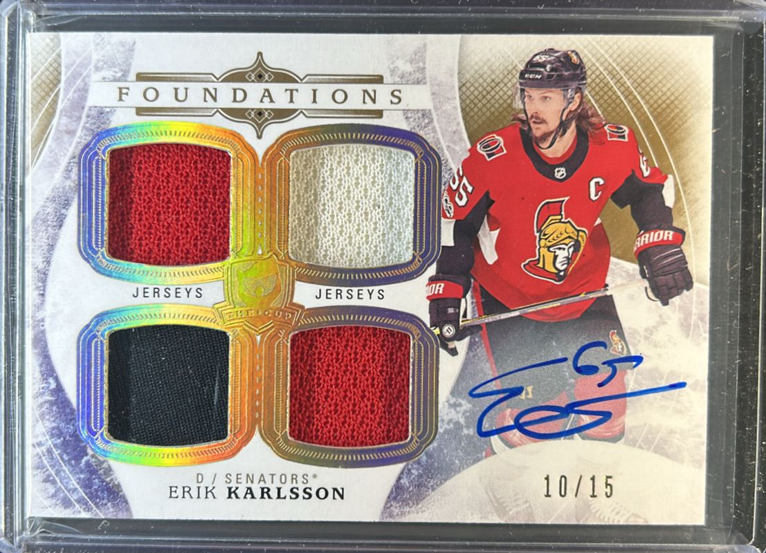 The Erik Karlsson 2017 Upper Deck The Cup #F-EK Cup Foundations Jersey Autographs /15 card is 1 of 27 Erik Karlsson's card variations in the 2017 Upper Deck The Cup set being tracked by Sports Card Investor, including Base /249, Gold Spectrum Foil /36, Gold Foil Patch /24, Red Foil Tag /8, and Green Foil Button /3.
