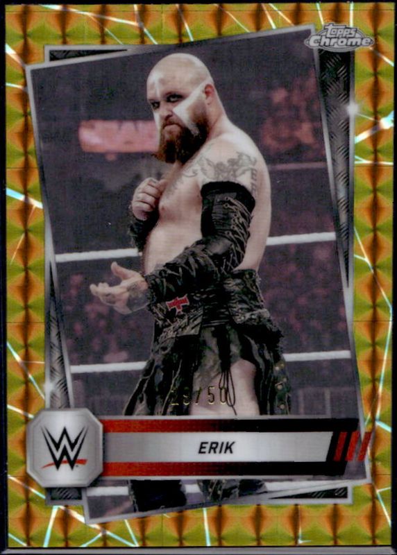 The Erik 2025 Topps Chrome WWE #38 Gold Geometric Refractor /50 card is 1 of 31 Erik's card variations in the 2025 Topps Chrome WWE set being tracked by Sports Card Investor, including Base, Geometric Refractor, Neon Green & Black Refractor, Prism Refractor, and Purple Refractor.
