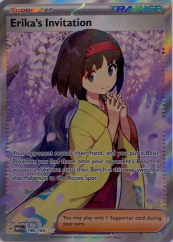 The Erika's Invitation 2023 Scarlet & Violet: 151 #196/165 Ultra Rare card in Raw TCG (Near Mint) condition has moved up $2.50 (+38.5%) in the last 30 days and was last sold for $8.99 .
