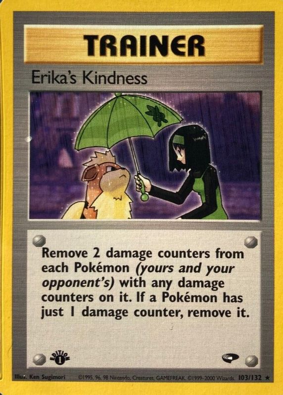 The Erika's Kindness 2000 Gym Challenge #103/132 1st Edition card in Raw TCG (Near Mint) condition has moved down -$15.00 (-60.0%) in the last 30 days and was last sold for $10.00 .