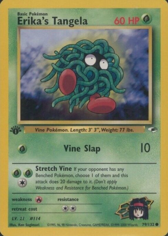 The Erika's Tangela 2000 Gym Heroes #079/132 1st Edition card in Raw TCG (Near Mint) condition has moved up $2.72 (+94.8%) in the last 30 days and was last sold for $5.59 .