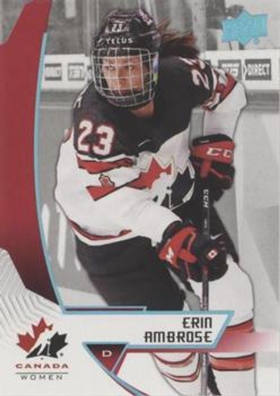 The Erin Ambrose 2019 Upper Deck Team Canada Juniors #57 Blue card is 1 of 11 Erin Ambrose's card variations in the 2019 Upper Deck Team Canada Juniors set being tracked by Sports Card Investor, including Base, Jersey Relics, Premium Swatch Autographs /199, Exclusives /150, and High Gloss /25.