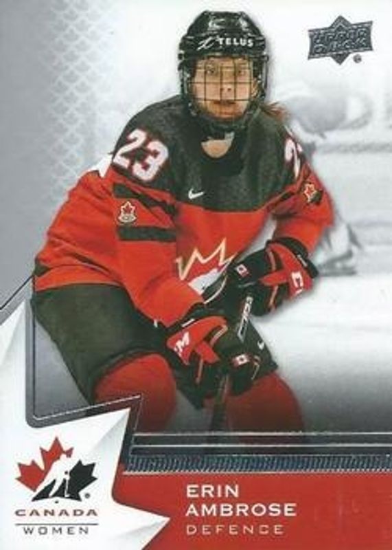 The Erin Ambrose 2020 Upper Deck Team Canada Juniors #60 Base card is 1 of 13 Erin Ambrose's card variations in the 2020 Upper Deck Team Canada Juniors set being tracked by Sports Card Investor, including Exclusives /165, High Gloss /15, Autographs - Purple, Blue, and Jerseys.