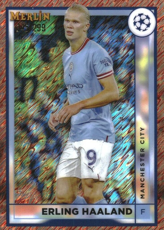 The Erling Haaland 2022 Topps Merlin Chrome UEFA Club Competitions #92 Rose Gold Shimmer Refractor /299 card in Raw condition has not changed in price in the last 30 days and was last sold for $14.99 .