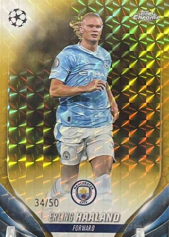 The Erling Haaland 2023 Topps Chrome UEFA Club Competitions #39 Gold Geometric Refractor /50 card in Raw condition has not changed in price in the last 30 days and was last sold for $40.00 .