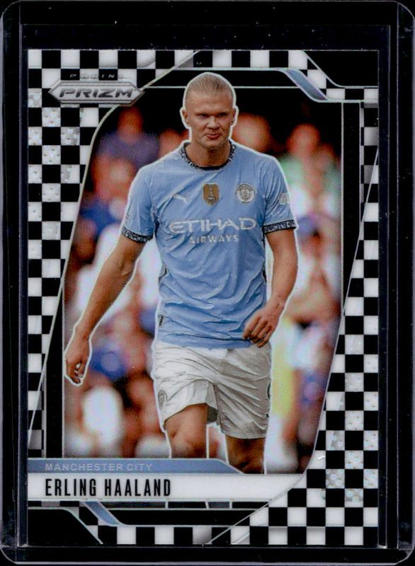 The Erling Haaland 2024 Prizm Premier League #9 Black & White Checker card is 1 of 90 Erling Haaland's card variations in the 2024 Prizm Premier League set being tracked by Sports Card Investor, including Base, Blue Mosaic, Breakaway, Choice, and Choice Red White & Blue.