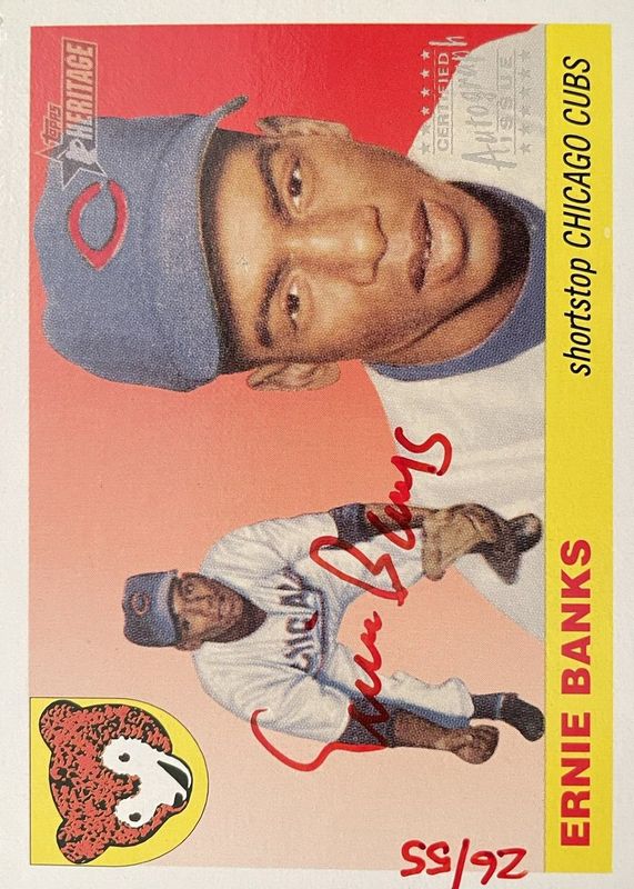 This card is 1 of 3 Ernie Banks' card variations in the 2004 Topps Heritage set being tracked by Sports Card Investor, including Real One Autographs, and Clubhouse Collection Autographs Relics /25.