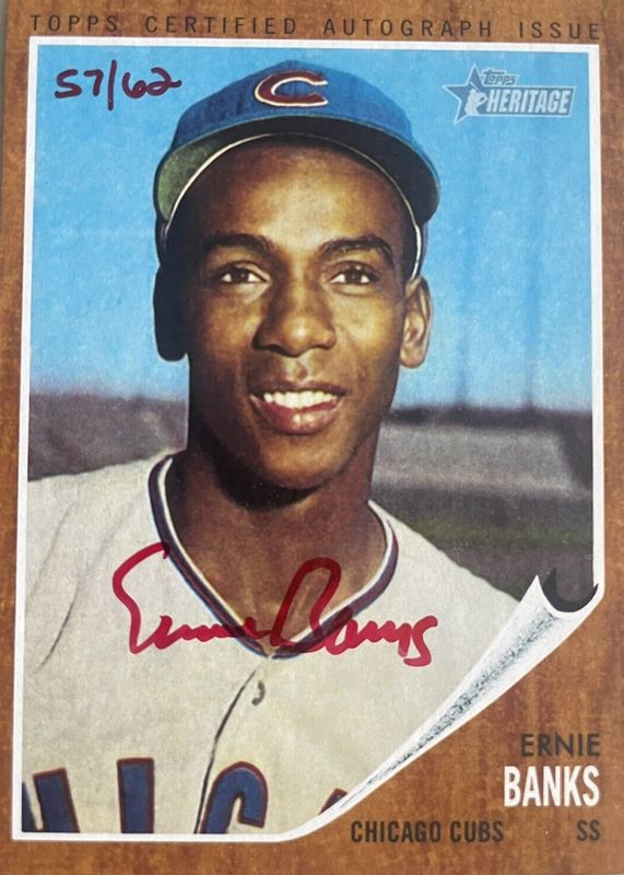 The Ernie Banks 2011 Topps Heritage #ROA-EB Real One Autographs - Red Ink /62 card in Raw condition has not changed in price in the last 30 days and was last sold for $355.00 .