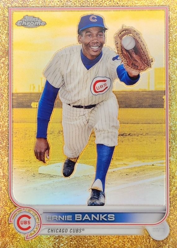 This card is 1 of 5 Ernie Banks' card variations in the 2022 Topps Gilded Collection set being tracked by Sports Card Investor, including Mini-Diamond Gold Etch Refractor /50, RayWave Gold Etch Refractor /25, Lava Gold Etch Refractor /10, and Superfractor /1.