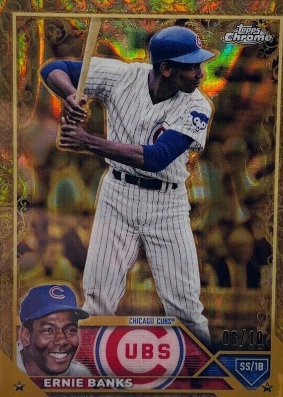 This card is 1 of 7 Ernie Banks' card variations in the 2023 Topps Gilded Collection set being tracked by Sports Card Investor, including Base /99, Wave Gold Etch Refractor /75, Mini-Diamond Gold Etch Refractor /50, RayWave Gold Etch Refractor /25, and Superfractor /1.