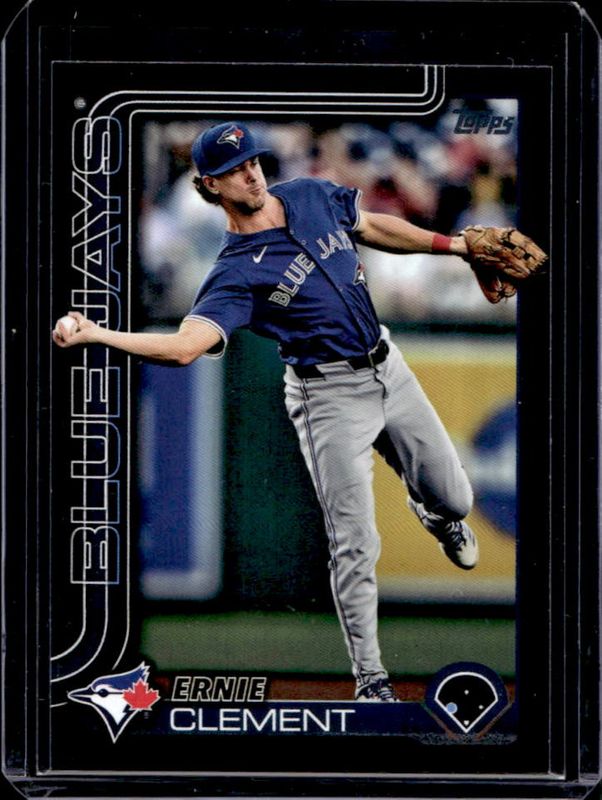 The Ernie Clement 2025 Topps #319 Black /74 card is 1 of 63 Ernie Clement's card variations in the 2025 Topps set being tracked by Sports Card Investor, including Base, Aqua Holo Foil, Diamante Foil, Holo Foil, and Pink Diamante Foil.