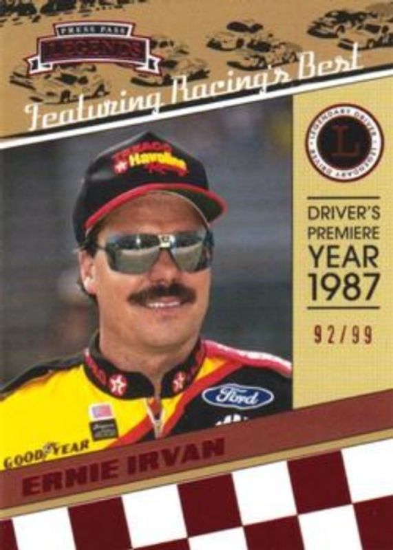 The Ernie Irvan 2011 Press Pass Legends #18 Red /99 card is 1 of 33 Ernie Irvan's card variations in the 2011 Press Pass Legends set being tracked by Sports Card Investor, including Base, Gold /250, Holofoil /25, Purple /25, and Press Plates Black /1.