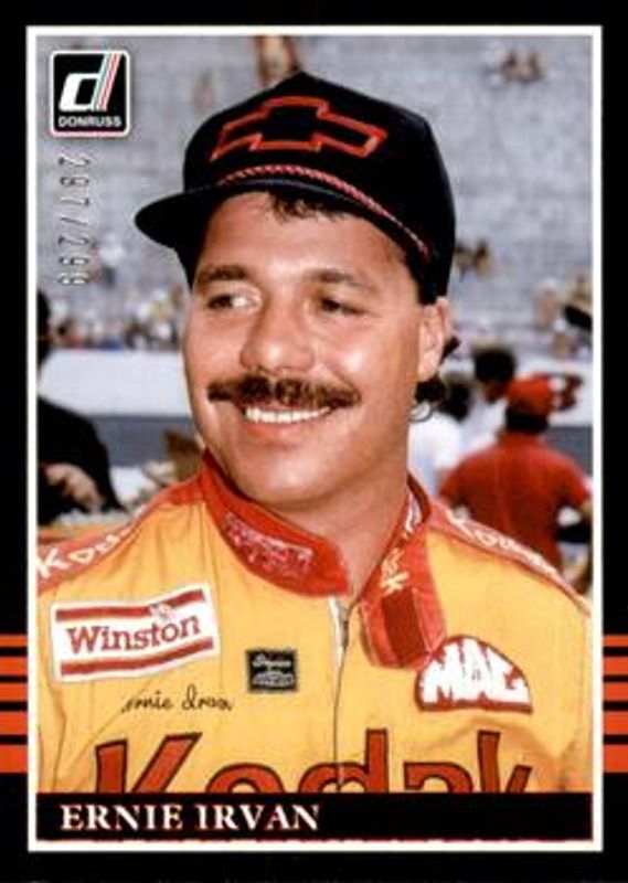 The Ernie Irvan 2018 Donruss NASCAR #110 Red Foil /299 card is 1 of 25 Ernie Irvan's card variations in the 2018 Donruss NASCAR set being tracked by Sports Card Investor, including #110 Base, #165 Base, #165 Gold Foil /499, #110 Gold Foil /499, and #165 Red Foil /299.
