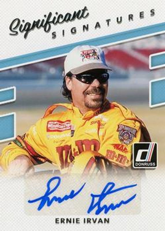 The Ernie Irvan 2018 Donruss NASCAR #SS-EI Significant Signatures card is 1 of 25 Ernie Irvan's card variations in the 2018 Donruss NASCAR set being tracked by Sports Card Investor, including #110 Base, #165 Base, #165 Gold Foil /499, #110 Gold Foil /499, and #110 Red Foil /299.