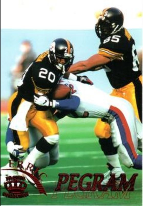 The Erric Pegram 1996 Pacific Gridiron #97 Red card is 1 of 5 Erric Pegram's card variations in the 1996 Pacific Gridiron set being tracked by Sports Card Investor, including Base, Copper, Gold, and Platinum.