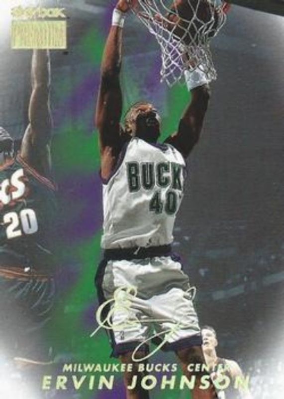 The Ervin Johnson 1998 Skybox Premium #138 Base card is 1 of 4 Ervin Johnson's card variations in the 1998 Skybox Premium set being tracked by Sports Card Investor, including Star Rubies /50, Autographics, and Autographics Blue /50.