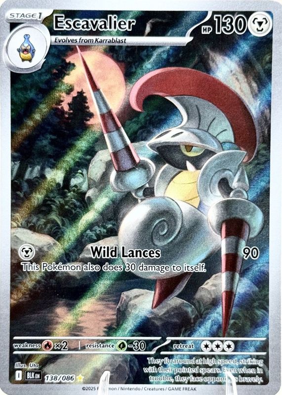 The Escavalier 2025 Scarlet & Violet: Black Bolt #138/086 Illustration Rare card in Raw TCG (Near Mint) condition has moved down -$4.44 (-34.3%) in the last 30 days and was last sold for $8.50 .