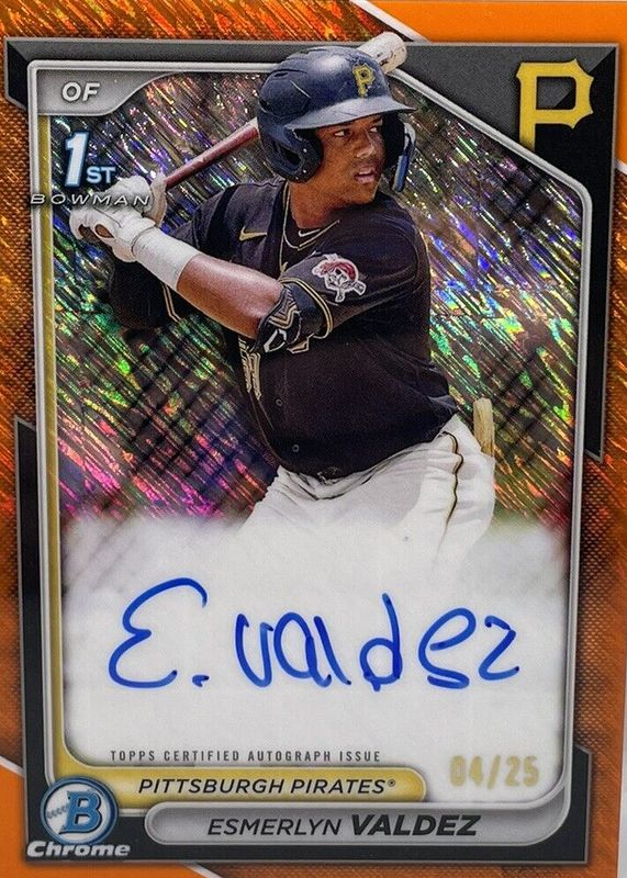 The Esmerlyn Valdez 2024 Bowman #CPA-EV Chrome Prospect Auto - Orange Shimmer Refractor /25 (1st) card in Raw condition has not changed in price in the last 30 days and was last sold for $475.00 .