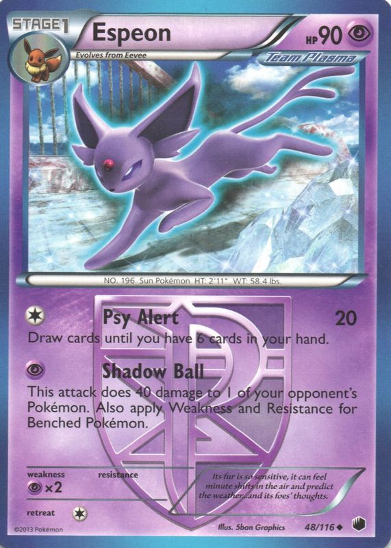 The Espeon 2013 Black & White: Plasma Freeze #048/116 Base card in Raw TCG (Lightly Played) condition has moved up $1.32 (+50.4%) in the last 30 days and was last sold for $3.94 .