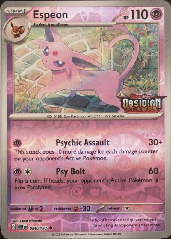 The Espeon 2023 Scarlet & Violet: Obsidian Flames #086/197 Reverse Holo - Best Buy Exclusive card in Raw TCG (Near Mint) condition has not changed in price in the last 30 days and was last sold for $16.18 .