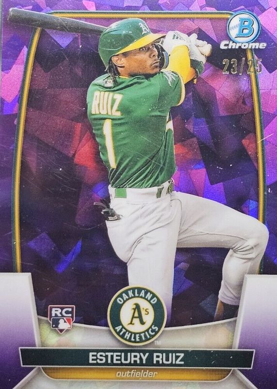The Esteury Ruiz 2023 Bowman Chrome Sapphire Edition #46 Purple /25 Rookie card in Raw condition has not changed in price in the last 30 days and was last sold for $16.00 .