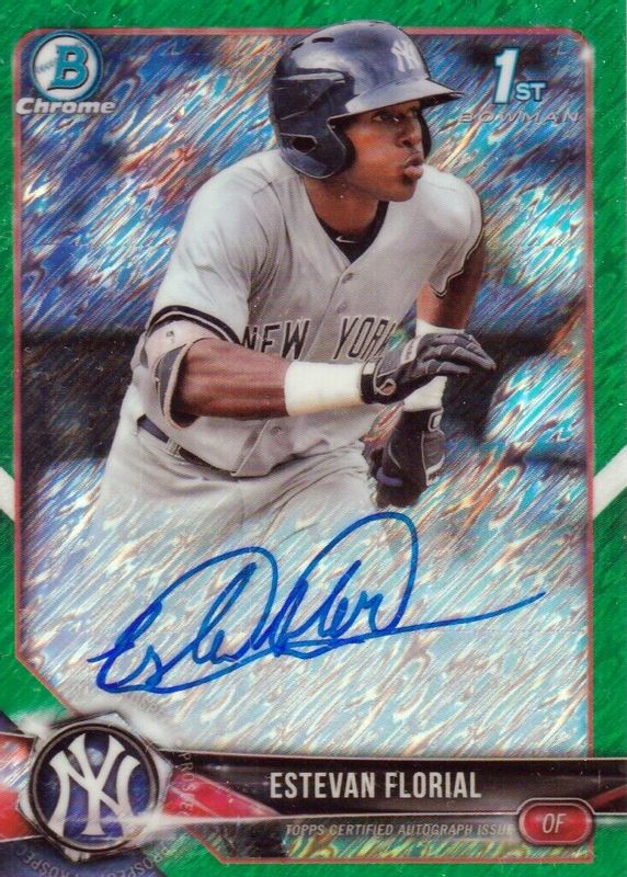 The Estevan Florial 2018 Bowman Chrome #CPA-EF Prospect Auto - Green Shimmer Refractor /99 (1st) card in Raw condition has not changed in price in the last 30 days and was last sold for $10.00 .