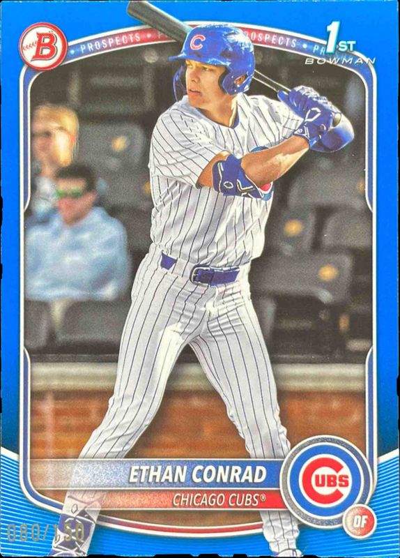 The Ethan Conrad 2025 Bowman Draft #BD-17 Blue Border /150 card is 1 of 86 Ethan Conrad's card variations in the 2025 Bowman Draft set being tracked by Sports Card Investor, including Base, Chrome (1st), Chrome - Lazer Refractor (1st), Chrome - Refractor (1st), and Chrome - Sky Blue Refractor (1st).