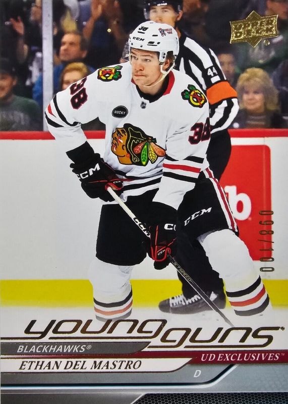 The Ethan Del Mastro 2024 Upper Deck #221 Young Guns - UD Exclusives /100 Rookie card in Raw condition has not changed in price in the last 30 days and was last sold for $40.00 .