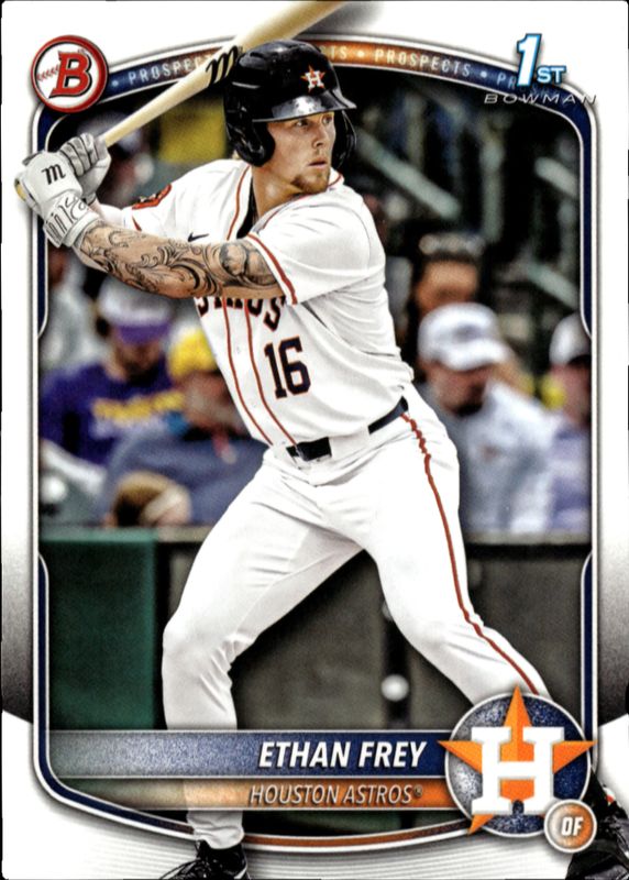 The Ethan Frey 2025 Bowman Draft #BD-67 Base card is 1 of 85 Ethan Frey's card variations in the 2025 Bowman Draft set being tracked by Sports Card Investor, including Chrome (1st), Chrome - Lazer Refractor (1st), Chrome - Refractor (1st), Chrome - Sky Blue Refractor (1st), and Chrome - X-Fractor (1st).
