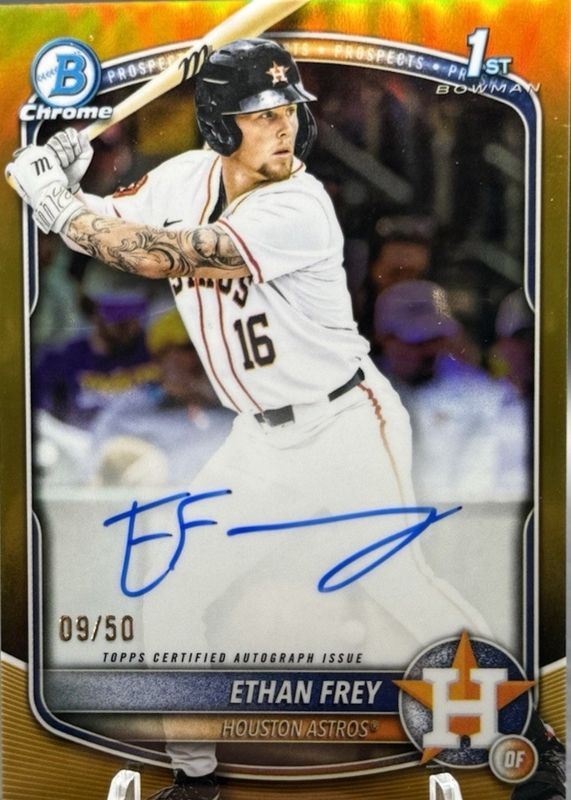 The Ethan Frey 2025 Bowman Draft #CPA-EF Chrome Prospect Auto - Gold Refractor /50 (1st) card in Raw condition has not changed in price in the last 30 days and was last sold for $450.00 .