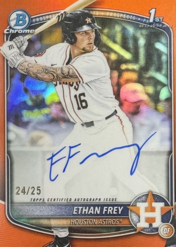 The Ethan Frey 2025 Bowman Draft #CPA-EF Chrome Prospect Auto - Orange Refractor /25 (1st) card in Raw condition has not changed in price in the last 30 days and was last sold for $1,001.00 .