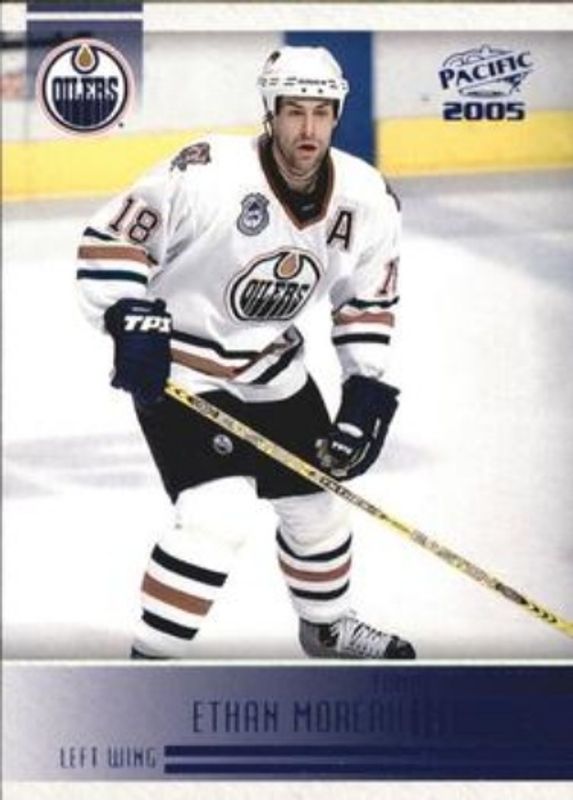 The Ethan Moreau 2004 Pacific #104 Blue /250 card is 1 of 3 Ethan Moreau's card variations in the 2004 Pacific set being tracked by Sports Card Investor, including Base, and Red.