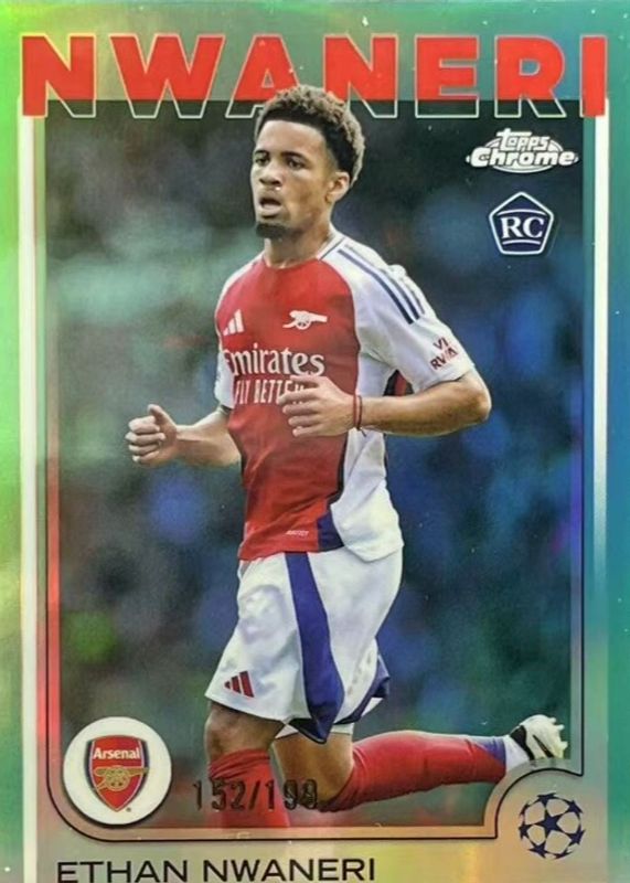 This card is 1 of 48 Ethan Nwaneri's card variations in the 2024 Topps Chrome UEFA Club Competitions set being tracked by Sports Card Investor, including Base, Geometric Refractor, Hongbao Red Refractor, Magenta Shimmer Refractor, and Pulsar Refractor.