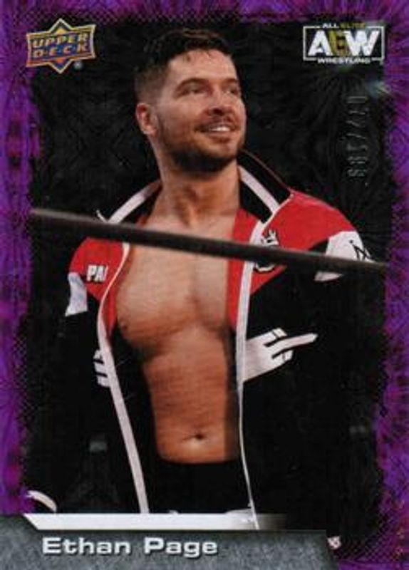 The Ethan Page 2022 Upper Deck AEW #8 Purple Pyro /199 card is 1 of 23 Ethan Page's card variations in the 2022 Upper Deck AEW set being tracked by Sports Card Investor, including Base, Gold, Pyro, Silver Foil, and Green Pyro /399.