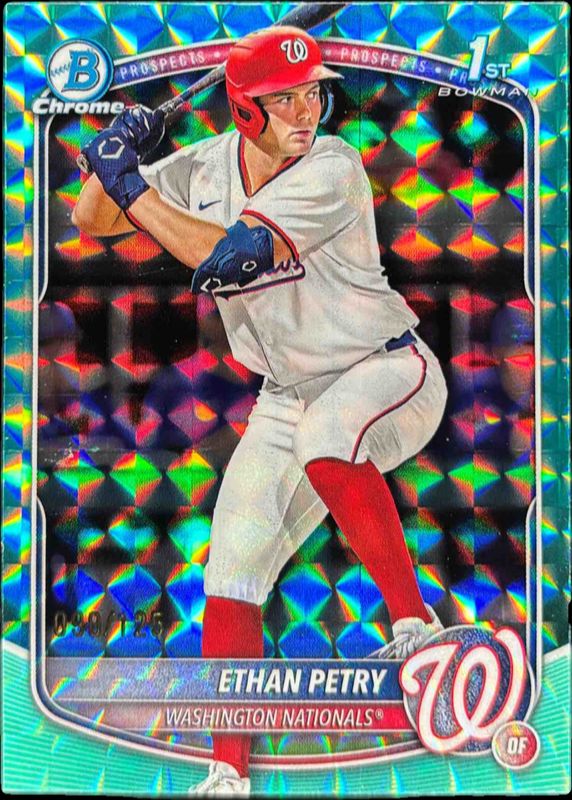 The Ethan Petry 2025 Bowman Draft #BDC-151 Chrome - Aqua Geometric Refractor /125 card is 1 of 86 Ethan Petry's card variations in the 2025 Bowman Draft set being tracked by Sports Card Investor, including Base, Chrome, Chrome - Lazer Refractor, Chrome - Refractor, and Chrome - Sky Blue Refractor.