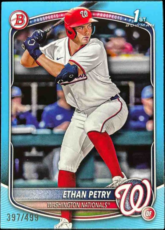 The Ethan Petry 2025 Bowman Draft #BD-151 Sky Blue Border /499 card is 1 of 86 Ethan Petry's card variations in the 2025 Bowman Draft set being tracked by Sports Card Investor, including Base, Chrome, Chrome - Lazer Refractor, Chrome - Refractor, and Chrome - Sky Blue Refractor.