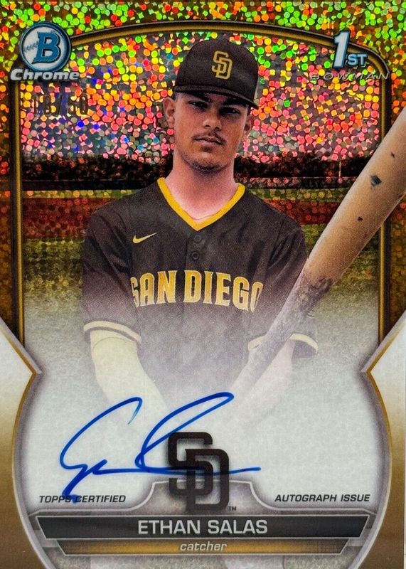 Best Prices Available For Sale of Ethan Salas 2023 Bowman Chrome #CPA-ESS Prospect Auto - Gold Mini-Diamond Refractor /50 (1st)