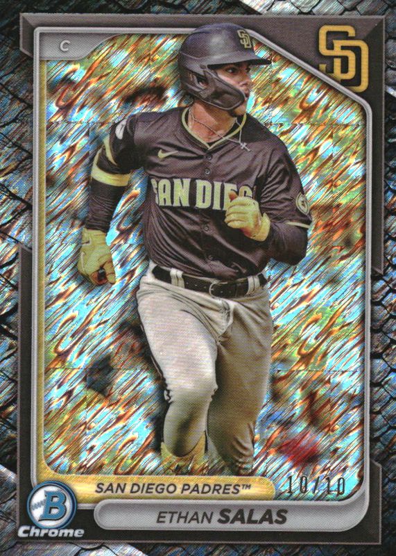 This card is 1 of 22 Ethan Salas' card variations in the 2024 Bowman Chrome set being tracked by Sports Card Investor, including Prospects - Green Refractor /99, Prospects - Reptilian Green Refractor /99, Prospects - Yellow Refractor /75, Prospects - Gold Refractor /50, and Prospects - Gold Shimmer Refractor /50.