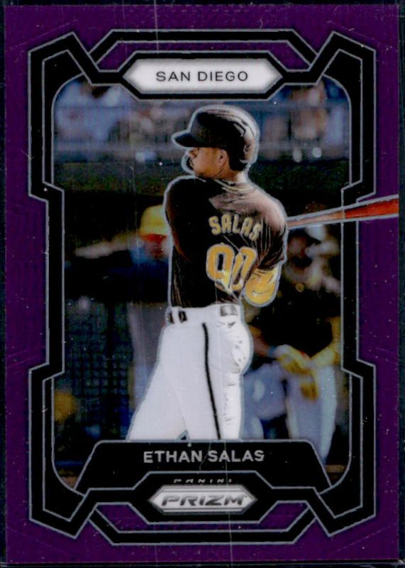 The Ethan Salas 2024 Prizm #141 Purple /99 card is 1 of 71 Ethan Salas' card variations in the 2024 Prizm set being tracked by Sports Card Investor, including Base, Blue Ice, Green, Green Ice, and Pink Ice.