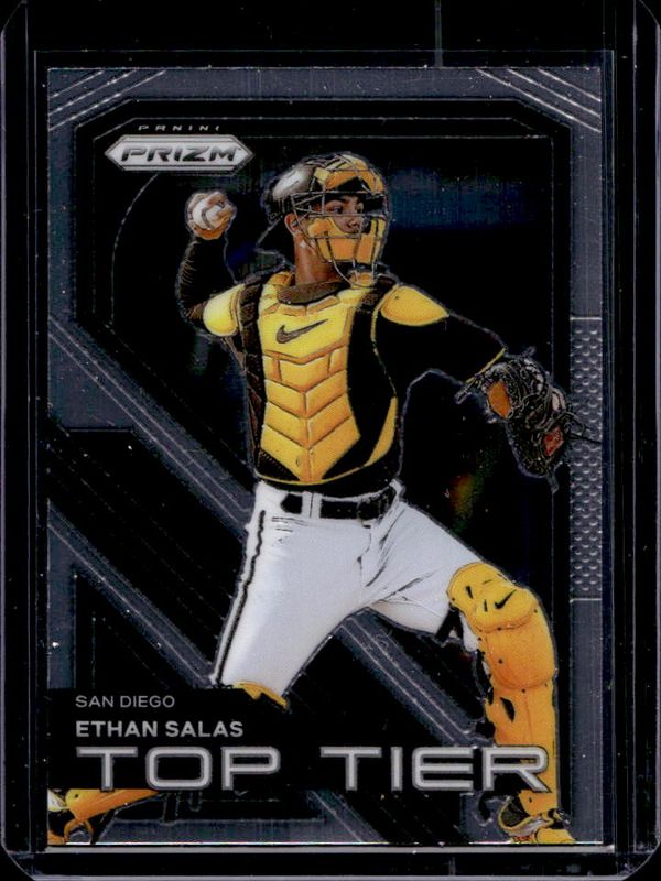 The Ethan Salas 2024 Prizm #5 Top Tier card is 1 of 71 Ethan Salas' card variations in the 2024 Prizm set being tracked by Sports Card Investor, including Base, Blue Ice, Green, Green Ice, and Pink Ice.