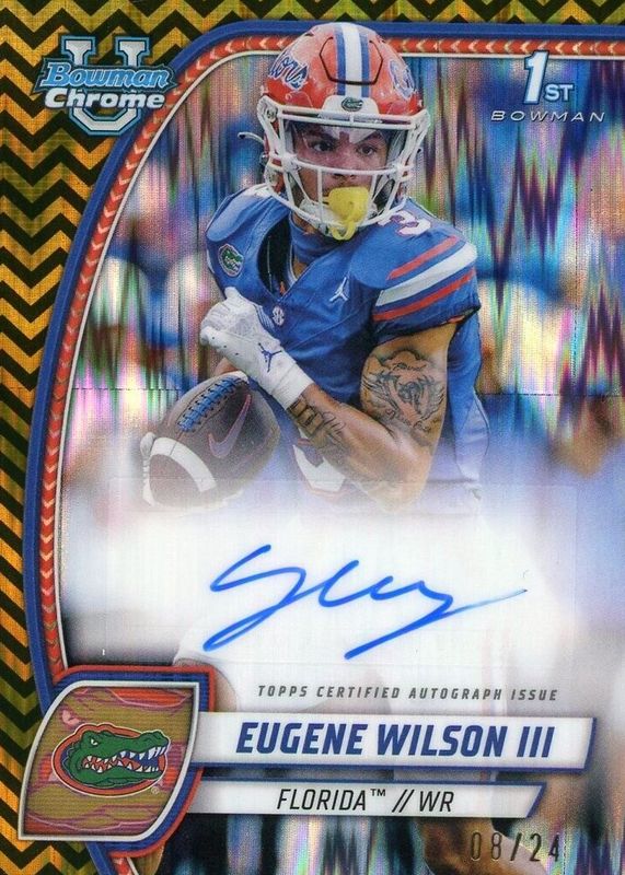 This card is 1 of 17 Eugene Wilson III's card variations in the 2024 Bowman Chrome University set being tracked by Sports Card Investor, including Image Variation (1st), Prospect Auto (1st), Prospect Auto - Stealth Refractor (1st), Prospect Auto - Refractor /299 (1st), and Prospect Auto - Fuchsia Refractor /150 (1st).
