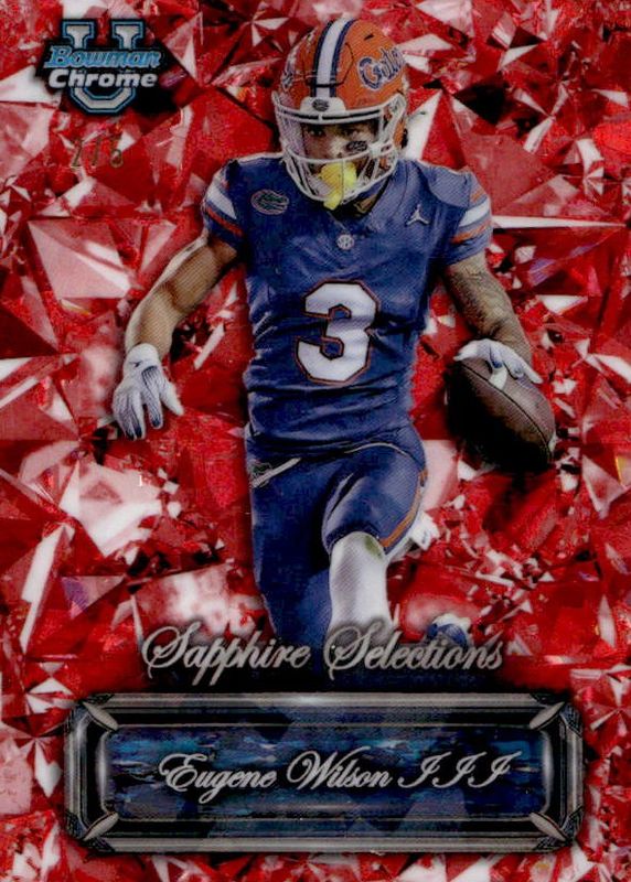 This card is 1 of 15 Eugene Wilson III's card variations in the 2024 Bowman Chrome University Sapphire Edition set being tracked by Sports Card Investor, including Prospect Auto (1st), Sapphire Selections, Sapphire Selections Autographs, Prospect Auto - Orange /25 (1st), and Sapphire Selections Autographs - Orange /25.