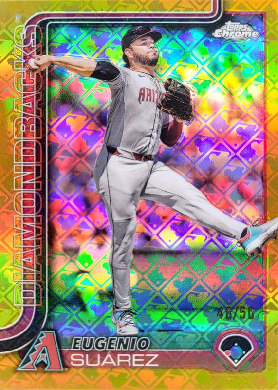 The Eugenio Suarez 2025 Topps Chrome Logofractor Edition #48 Gold Refractor /50 card is 1 of 12 Eugenio Suarez's card variations in the 2025 Topps Chrome Logofractor Edition set being tracked by Sports Card Investor, including Base, Purple Refractor /250, Aqua Refractor /199, Blue Refractor /150, and Green Refractor /99.
