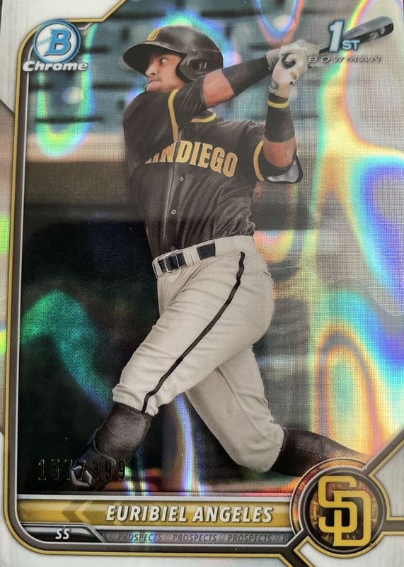 This card is 1 of 40 Euribiel Angeles' card variations in the 2022 Bowman set being tracked by Sports Card Investor, including Chrome Prospects (1st), Chrome Prospects - Refractor /499 (1st), Chrome Prospects - Speckle Refractor /299 (1st), Chrome Prospects - Purple RayWave Refractor /250 (1st), and Chrome Prospects - Purple Refractor /250 (1st).
