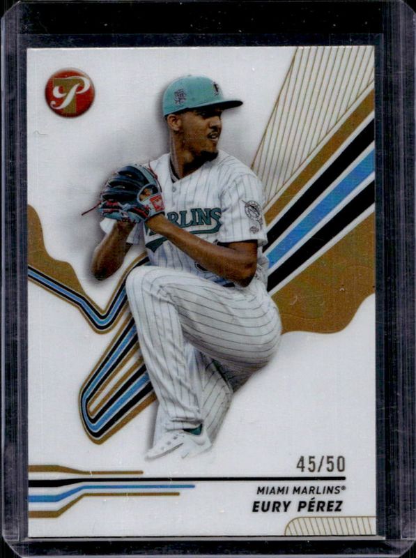 The Eury Perez 2024 Topps Pristine #108 Gold Refractor /50 card is 1 of 18 Eury Perez's card variations in the 2024 Topps Pristine set being tracked by Sports Card Investor, including Base, Pristine Refractor, Refractor, Green Refractor /150, and Pristine Purple Refractor /99.