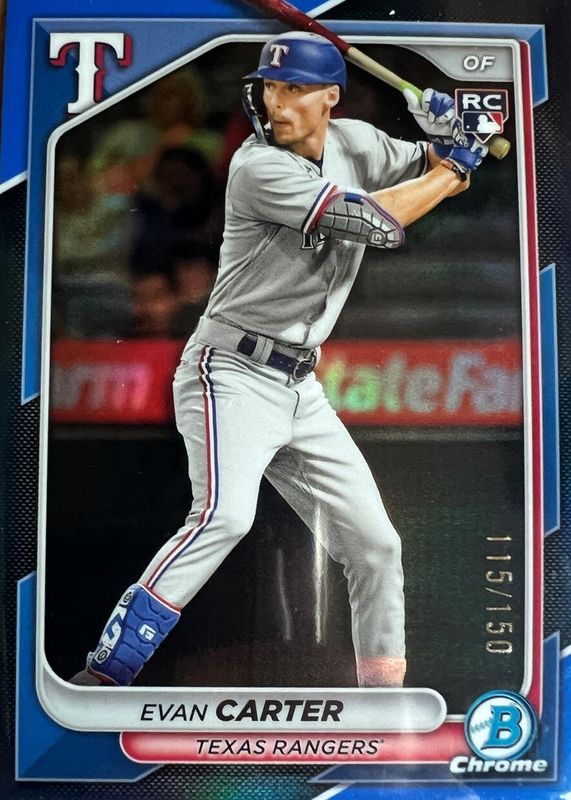 The Evan Carter 2024 Bowman Chrome #65 Blue Refractor /150 Rookie card in Raw condition has moved up $2.13 (+51.6%) in the last 30 days and was last sold for $6.26 .