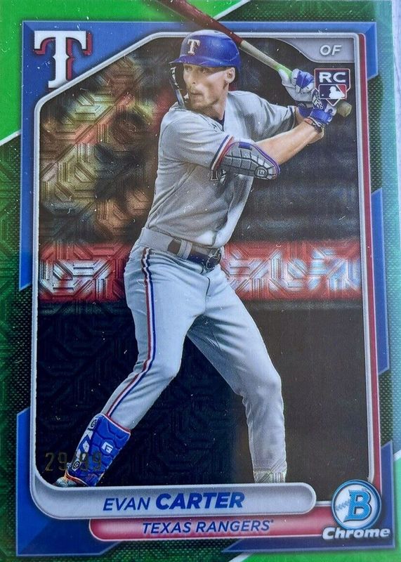 Best Prices Available For Sale of Evan Carter 2024 Bowman Chrome Mega Box #65 Green Mojo Refractor /99