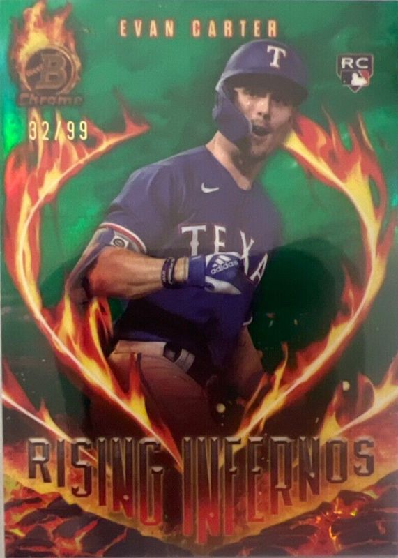 2024 Bowman Chrome Evan Carter Rising Inferno Green Refractor /99 Rookie Rangers