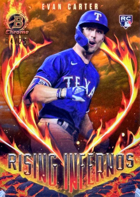 The Evan Carter 2024 Bowman #RI-5 Rising Infernos - Orange Refractor /25 Rookie card in Raw condition has not changed in price in the last 30 days and was last sold for $47.00 .